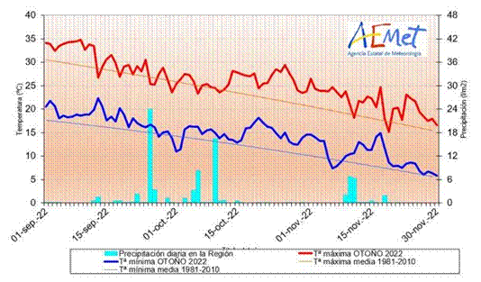 El carácter termométrico del trimestre, septiembre, octubre y noviembre de 2022, ha sido extremadamente cálido, lo que lo sitúa como el otoño más cálido desde, al menos, 1961, superando en 8 décimas a la anterior efeméride, 18,8 ºC, registrada en el otoño de 1983.