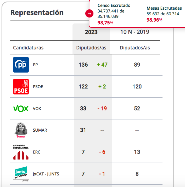 ERC también sale dañado al perder 6 escaños, mientras que Bildu gana uno. Respecto a las cifras de votos, son similares las papeletas del PP en este 23 de julio (7.916.586) y las del PSOE (7.634.789). Esto también hay quien lo interpreta como que se podría volver al bipartidismo.