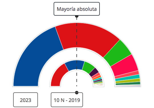 El Partido Popular ha sido el más votado, pasando de 89 a 136 escaños para el Congreso con respecto a 2019, pero el PSOE, con cifra similar (de 120 a 122) rompe sondeos y augurios que le eran muy negativos. Por su parte, VOX es el peor parado al pasa de 62 a 33 escaños y Sumar debuta con 31. A partir de ahora se vislumbran pactos con ‘encaje de bolillos’, sin que se descarte otra convocatoria electoral.