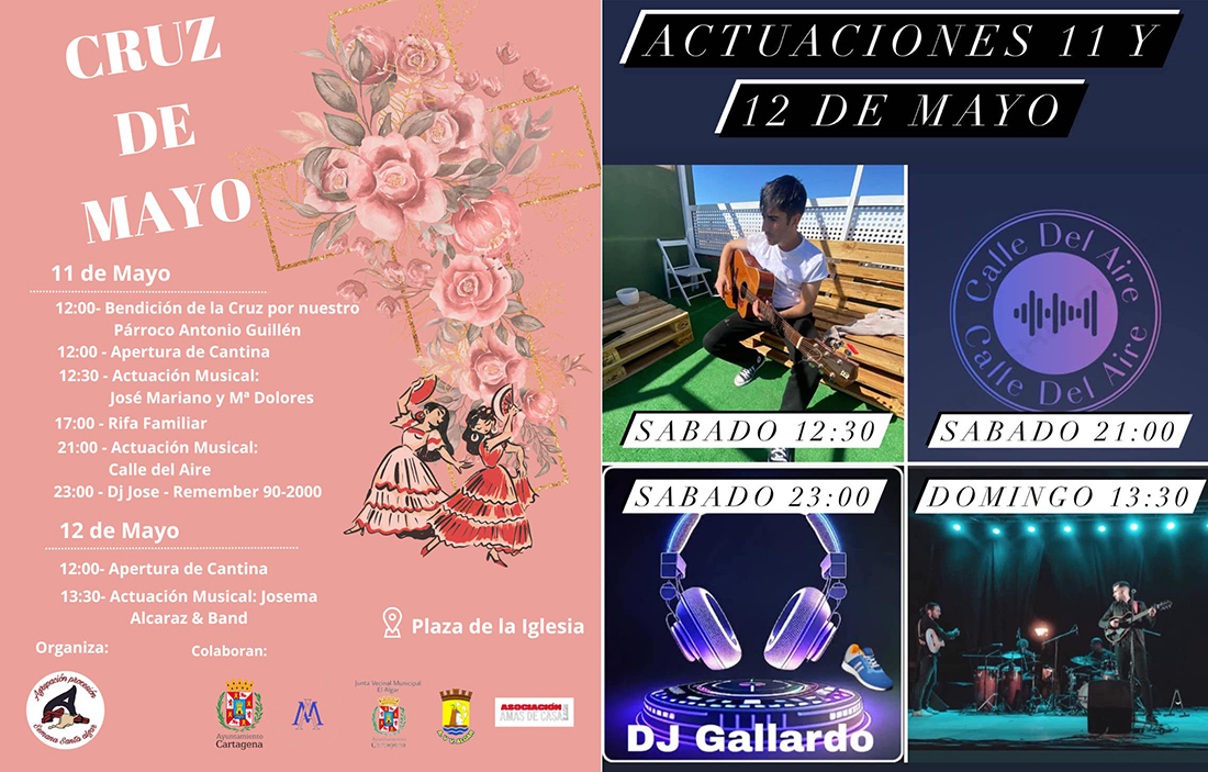 Triple propuesta en el Apolo con humor, musical infantil y teatro, mientras que las 'cruces de mayo' se montan en la plaza de la Iglesia y en el centro cívico. En el deporte, sigue la AD Algar Surmenor compitiendo en el Nacional cadete de voleibol de Asturias, mientras que en fútbol hay 15 partidos para los equipos del CD Algar, incluida la despedida de la Tercera RFEF del primer equipo. En Los Urrutias, sábado tarde para la lotería familiar.