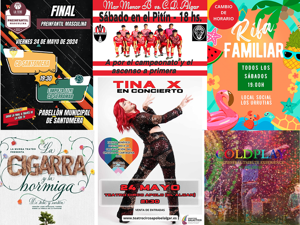 Comienza fuerte el programa, pues el CB Sierramar disputa el título regional de baloncesto preinfantil esta tarde en Santomera y hay dos propuestas sobre el escenario del Apolo, con una tercera musical para mañana noche. Además, juegan 12 equipos del CD Algar de fútbol, destacando que el juvenil puede lograr el ascenso. Se amplía la relación con las rifas familiares de Los Urrutias.