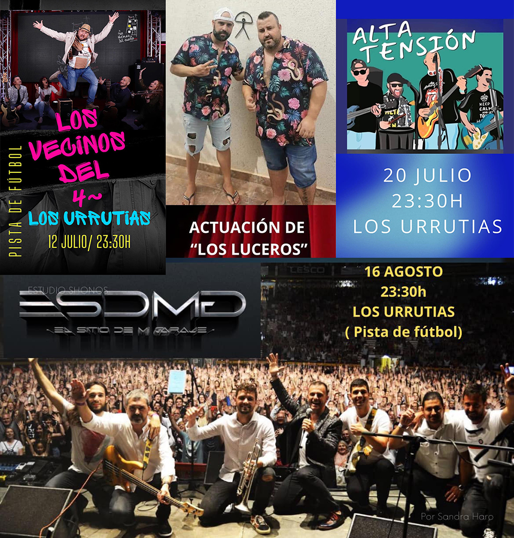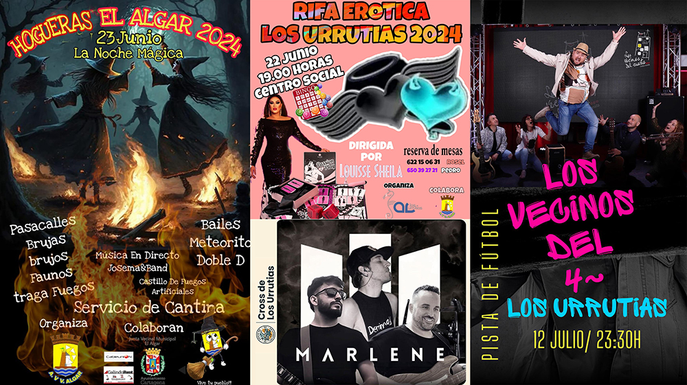 Lo más próximo es la rifa erótico de Los Urrutias del día 22 de junio, para al día siguiente tener lugar en El Algar la noche mágica de las hogueras de San Juan con brujas, faunas, trafuegos, etc. En cuanto a las fiestas de Los Urrutias, la asociación de vecinos avanza que el carnaval será el 20 de julio, noche que tendrá la actuación de 'Alta tensión', siendo otros artistas que pasarán por el escenario 'Los vecinos del cuarto' (12 de julio), 'Los luceros' (31 de julio), 'El sitio de mi garaje' (16 de agosto), entre otros. Antes, el 6 de julio se estrenará el cross urrutiense, siendo 'Marlene' la banda que pondrá música a la fiesta que habrá tras las carreras.