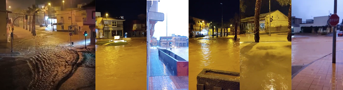 El Algar ha registrado esta pasada madrugada 139 litros de lluvia por metro cuadrado (datos de Ametse), a lo que se ha unido el agua procedente de la sierra minera, convirtiendo varias zonas, como la plaza del Hondo, en intransitables. Ha tenido lugar desde pasadas la una y media y hasta poco antes de las tres, estando acompañada por sonoros truenos y rayos, como puede observarse en dos de las fotos del montaje elaborado con escenas de Juan Urrea Martínez y 'Desi Grypdobled'. Destacar que la comarca ha sufrido inundaciones, siendo San Javier la que más agua ha recibido. La Unidad Militar de Emergencias fue avisada ante el riesgo de desbordamiento de la rambla de Los Alcázares, siendo anulada más tarde la petición.