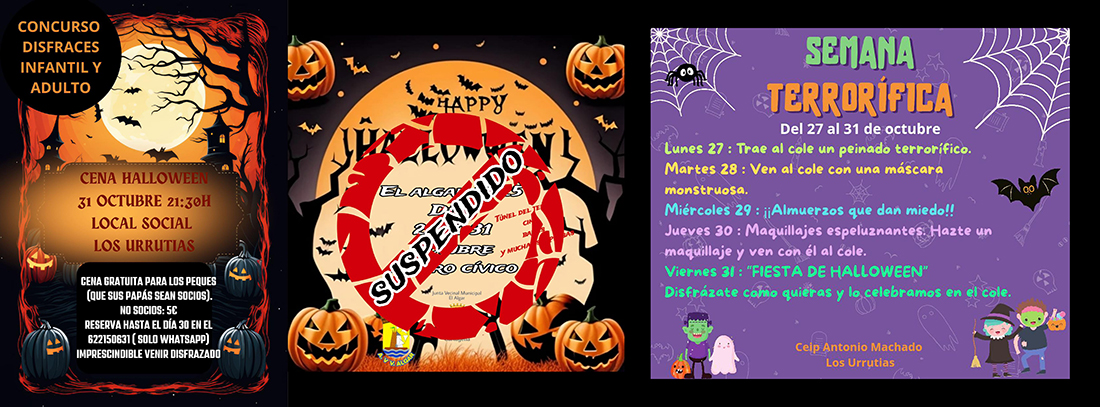 La Asociación de Vecinos de El Algar informa que por "distintas razones y a última hora" ha decidido no montar este año el tenebroso recorrido alrededor del centro multiusos. Sí habrá cena con concurso de disfraces en Los Urrutias, cuyo colegio también se apunta a la celebración con una 'Semana terrorífica'.