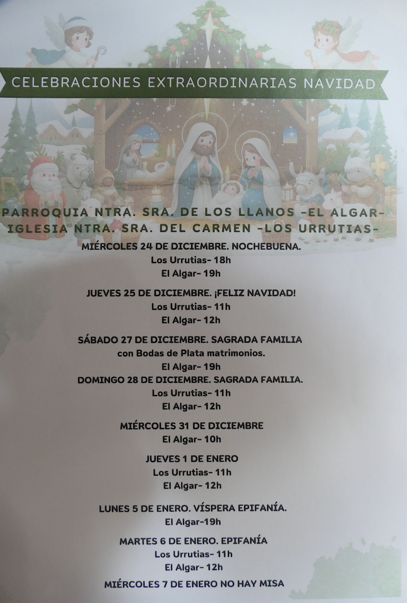 Las parroquias de Nuestra Señoras de los Llanos de El Algar y de Nuestra Señora del Carmen de Los Urrutias facilitan las fechas y horarios de las celebraciones extraordinarias de Navidad en ambas iglesias.