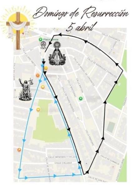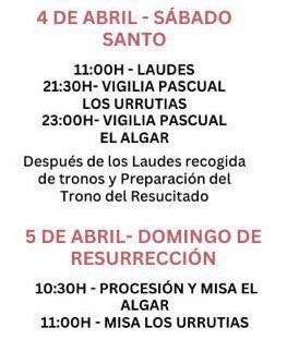 A las diez y media de la mañana es cuando está previsto que comience la eucaristía ante la fachada de la iglesia de Nuestra Señora de los Llanos, para después proclamar por el pueblo la resurrección de Jesucristo con la nueva procesión organizada por la Agrupación de la Semana Santa de El Algar, en colaboración con la parroquia. Está previsto que esta primera edición la protagonicen la nueva talla de Jesús Resucitado y la Virgen, encontrándose ambos al final, momento en el que caerá el manto negro que lleva la madre, por el luto de la muerte de su hijo, y emergerá el blanco de la alegría de la resurrección.