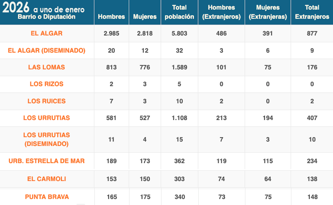 Los habitantes censados en la diputación de El Algar, que incluye la localidad algareña, Los Urrutias y Estrella de Mar, más los residentes en El Carmolí y Punta Brava alcanzan la cifra de 9.567 a fecha uno de enero de este año, cuando en la misma fecha de 2020 la cifra era de 5.250. En ese período, los extranjeros han pasado de 209 a 1.884. Los hombres, diferencia de gran parte del municipio, siguen siendo más que las mujeres.