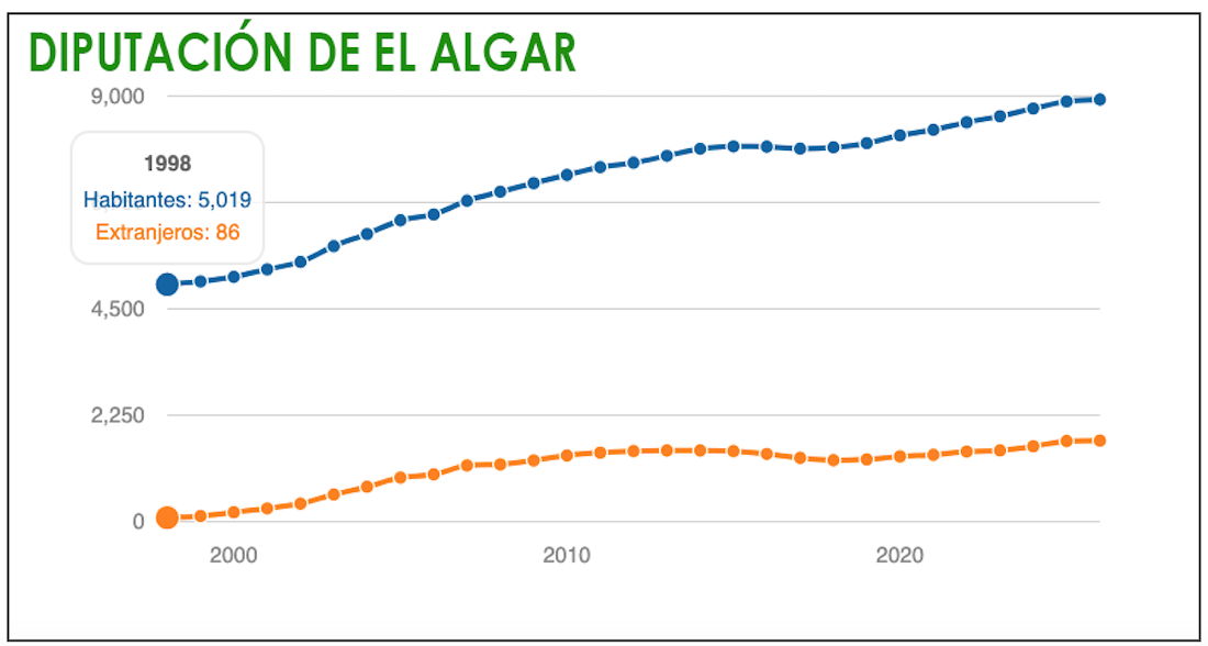 En este incremento de 4.317 personas, alrededor de una cuarta parte corresponde a la población extranjera, pues el incremento ha sido de 1.675 desde el inicio de este siglo y 451 desde a pandemia. También influye en la mayoría masculina global de hombres sobre mujeres, a diferencia del resto del municipio, cuyo total es de 111.980 féminas y 110.579 varones dentro de un total de 222.559 habitantes, lo que supone un aumento de 354 con respecto al año anterior. Reseñar, igualmente, que ese auge de residentes también tiene su reflejo en el periódico de El Algar, Los Urrutias y su gente con un constante aumento de lectores internautas.