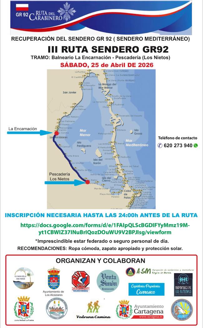 1. El presidente de la Junta Municipal de La Aparecida-La Puebla, Juan Manuel Ayaso, y vecinos de Bahía Bella estuvieron en la presentación del cartel de la tercera ruta Sendero GR92, cuya primera etapa se celebra este sábado entre el balneario de la Encarnación (Los Alcazares) y La Pescadería de Los Nietos (PINCHAR AQUÍ), con alto en Bahía Bella para la lectura de un manifiesto. Es novedad que este año la ruta se amplía con dos nuevas etapas: Los Nietos-Cabo de Palos y Cabo de Palos-Fuente de los Belones, cuyas fechas aún no están fijadas.