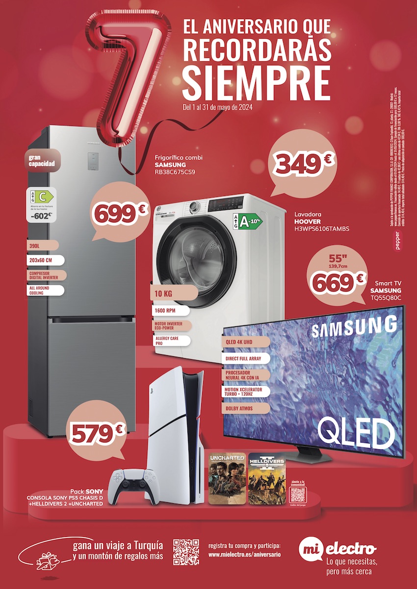 mi electro está en pleno séptimo aniversario con promociones inmejorables, como los precios que ha fijado hasta el último día de mayo, además de que puedes ganar un viaje a Turquía y un montón de regalos más. Somos lo que necesitas, pero más cerca. Estamos en la avenida de Filipinas de El Algar.