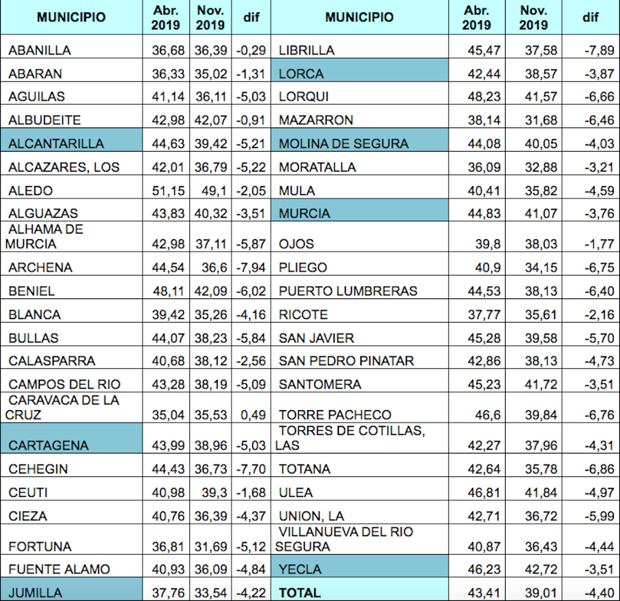 - En Cartagena ha pasado de un 43,99 a un 38,96 por ciento, lo que supone 5,03 menos