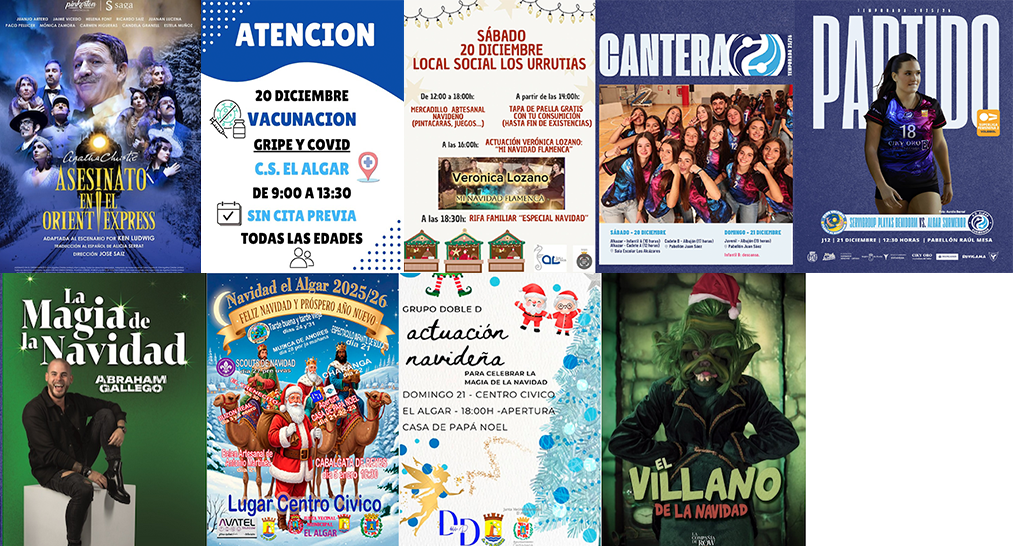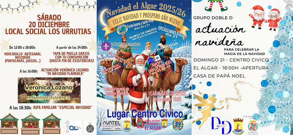 EL ALGAR. Domingo, 21 de diciembre. Por la mañana, inauguración del belén artesanal de Antonio Martínez en el local próximo a la iglesia / 18 horas. Apertura de la Casa de Papá Noel con actuación de ‘Doble D’ / Espectáculo infantil de Sulicato