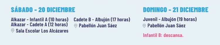 En fútbol, el CD Algar defiende su plaza de fase de ascenso ante el Archena, que está a dos puntos. Por su parte, el B viaja a Alhama y el juvenil, tras lograr la anterior jornada su segunda victoria, afronta un duelo clave entre equipos de la cola de clasificación. En baloncesto hay seis partidos del CB Sierramar, tres de ellos en pabellón escolar algareño. Descansa el CD Los Urrutias. En voleibol, viaja el equipo de la SF2 para afrontar un partido muy importante, mientras que las formaciones de su cantera tienen cuatro encuentros, uno de ellos en El Algar. Fuera del deporte, el Apolo tiene una diferente propuesta cada día, mientras que en El Algar se abre la casa de Papá Noel y se inaugura el belén de Antonio Martínez. Antes, el sábado, hay navidad flamenca en Los Urrutias con mercadillo artesanal, rifa familiar y tapas de arroz gratuitas con las bebidas que se consuman.