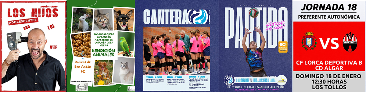 'Los hijos adolescentes' inician las propuestas hoy en el Apolo y mañana es el turno de la bendición de los animales en la iglesia de El Algar. Dentro del deporte, todo un reto para AD Algar Surmenor ante La Laguna Tenerife, mientras que CD Algar viaja a Lorca. También ofrecemos horarios, fechas y rivales en las competiciones regionales de baloncesto, fútbol y voleibol.
