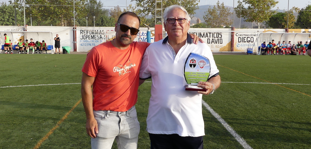 En la imagen se observa a José Antonio Martínez Mellinas arropado por su hijo, por representantes del CD Algar, por la edil algareña Paqui Martínez Sotomayor y, entre otros, por los presidentes de la Junta Vecinal Municipal y de la Asociación de Vecinos, respectivamente, Salvador García y Pedro García.