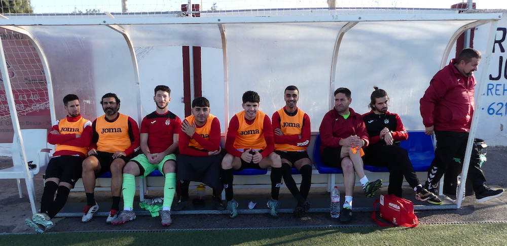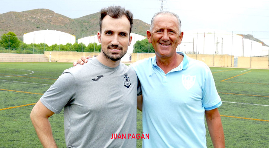 Álvaro Celdrán Raja, quien esta tarde será presentado a los jugadores, releva a Josema con el objetivo de frenar la pésima racha del equipo en preferente y evitar el descenso. En la foto se le observa, cuando era entrenador del Minerva de Alumbres, junto a Palomeque, entonces preparador de La Unión Atlético, en un partido de tercera división de 2022.