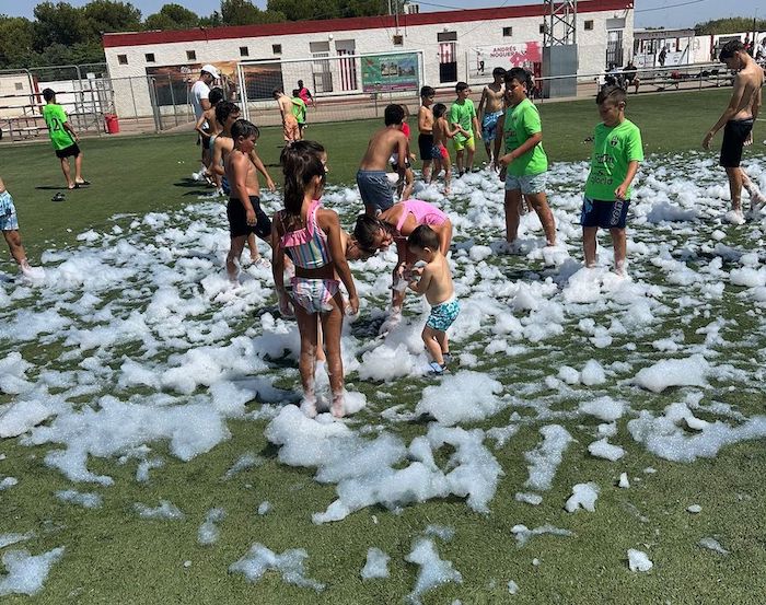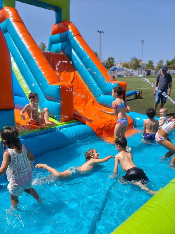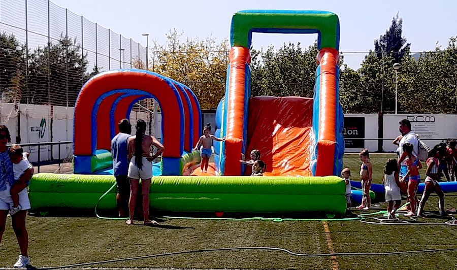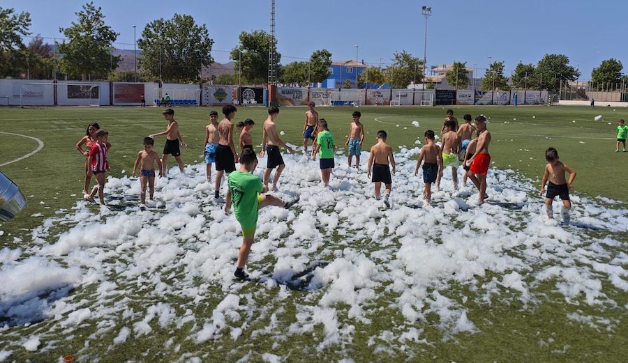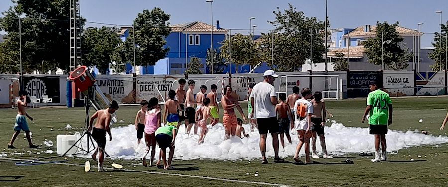 Imágenes de la fiesta de cierre de temporada de los equipos de base del CD Algar que tuvo lugar en el campo Sánchez Luengo. Hubo desfile de los equipos con sus entrenadores, batalla de globos, hinchables de agua con fiesta de la espuma, comida de convivencia, partido de padres contra entrenadores y música con 'Dambo DJ'.