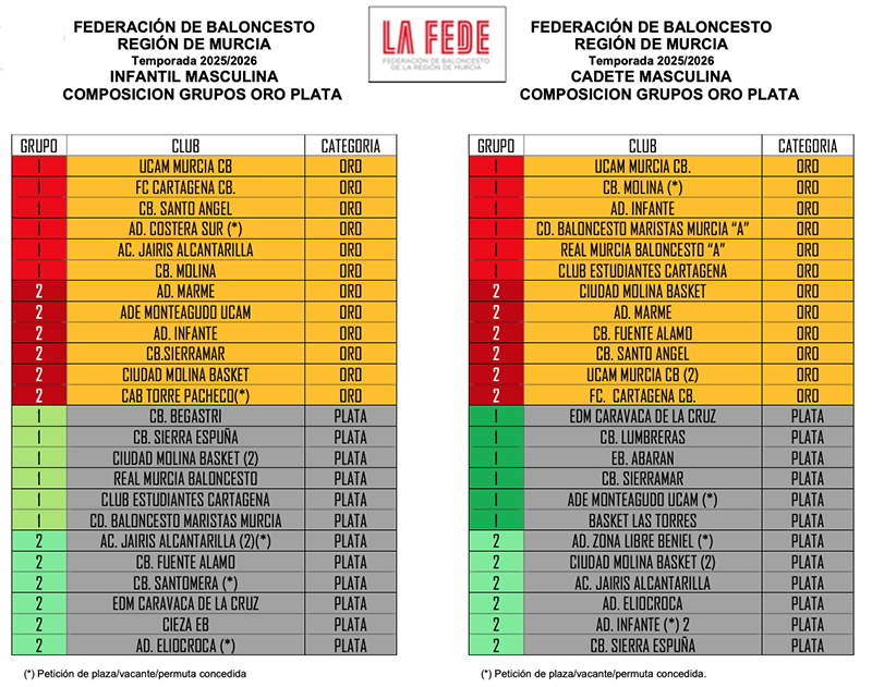 La Federación de Baloncesto de la Región de Murcia ha hecho pública la composición de los grupos Oro y Plata para las primeras categorías de base, con lo que el representante de nuestra zona geográfica ya conoce los que serán sus rivales en la temporada 2025/26.