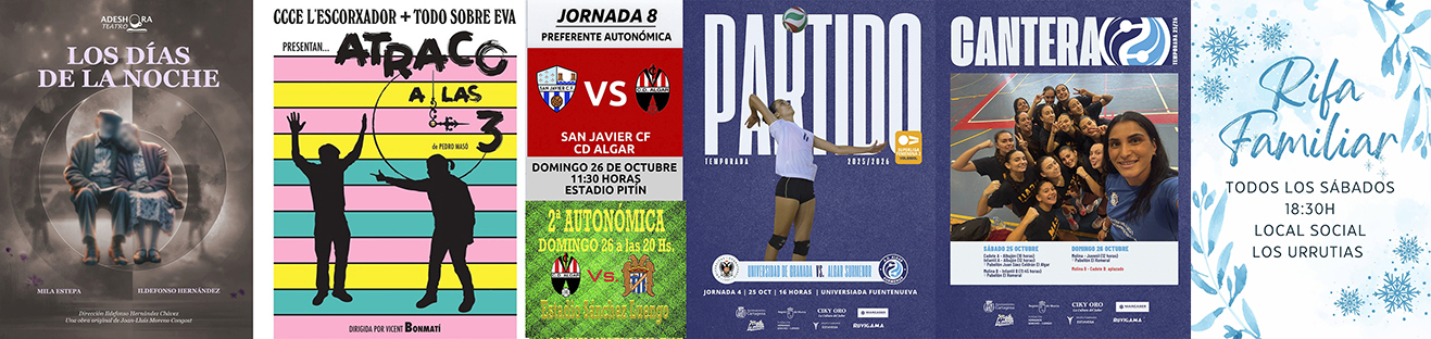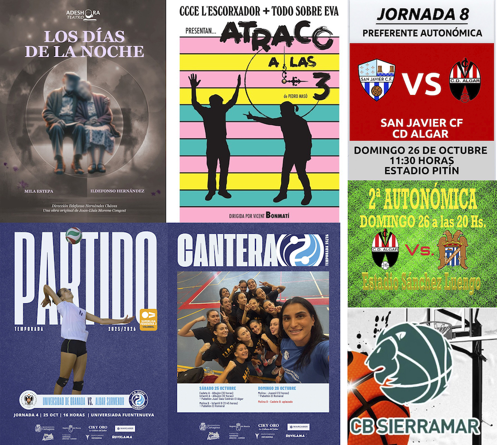El teatro es protagonista. Tras el humor de anoche con 'Cádiz', el sábado y el domingo son para las obras del certamen nacional de teatro aficionado y su acto de clausura. En voleibol, Surmenor viaja y de sus equipos de base hay dos que juegan en El Algar. También ofrecemos los partidos del CD Algar de fútbol y de los clubes de baloncesto del Sierramar y del CD Los Urrutias. Además, en la costa hay bingo esta tarde.