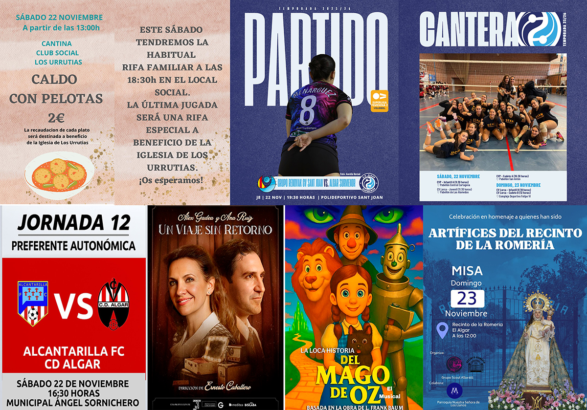Los Urrutias lleva a cabo actividades este sábado para ayudar a la iglesia por los daños sufridos en un reciente robo y en El Algar, además de las dos propuestas del Apolo, tiene una jornada de homenaje scout en el recinto de la romería este domingo. En el deporte, viajan AD Algar Surmenor y CD Algar. Ofrecemos fechas, horarios y rivales de los equipos de fútbol, voleibol y baloncesto en las competiciones federadas regionales.