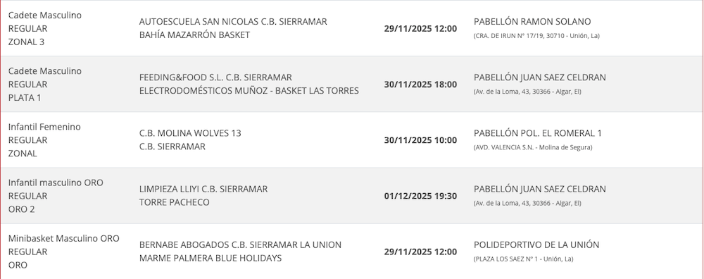 * Los equipos de segunda división sénior del CD Los Urrutias y CB Sierramar no tienen partidos de liga hasta el 14 de diciembre