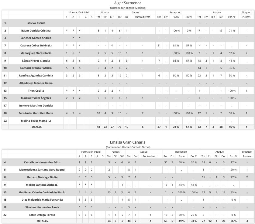 La ADAS ha sorprendido a propios y extraños, pues afrontaba un partido con mucho en juego y lo hacía en una pista, la de Cartagena, donde no ganaba desde el pasado 18 de octubre. Sin embargo, las chicas de Mariano Riganti han jugado con un 'rodillo' que no ha dado opciones al CV Emalsa Gran Canaria, al que además se le gana el promedio particular ('average'), pues en tierras canarias ganó el cuadro local por 3-2, lo que es bueno para el supuesto que ambas escuadras empaten a puntos en la clasificación. Los tanteos de 4-0 y 14-3 ya dejaban claro que la AD Algar Surmenor no iba a levantar el pie del acelerador y en todo el primer set su ventaja fue muy amplia. El segundo parecía que iba a ser otra cosa, pues empezó el cuadro visitante ganando hasta el 1-2, pero enseguida recuperó el mando ADAS, para despegarse con el 16-10 y 24-14. Con 2-0 en set a favor todo parecía encarrilado, pero no valían confianzas y a fe de que lo hicieron las locales, pues después del 3-3 cogieron 'carrerilla' (18-7) para ganar otra vez sin dar concesión a su adversario.