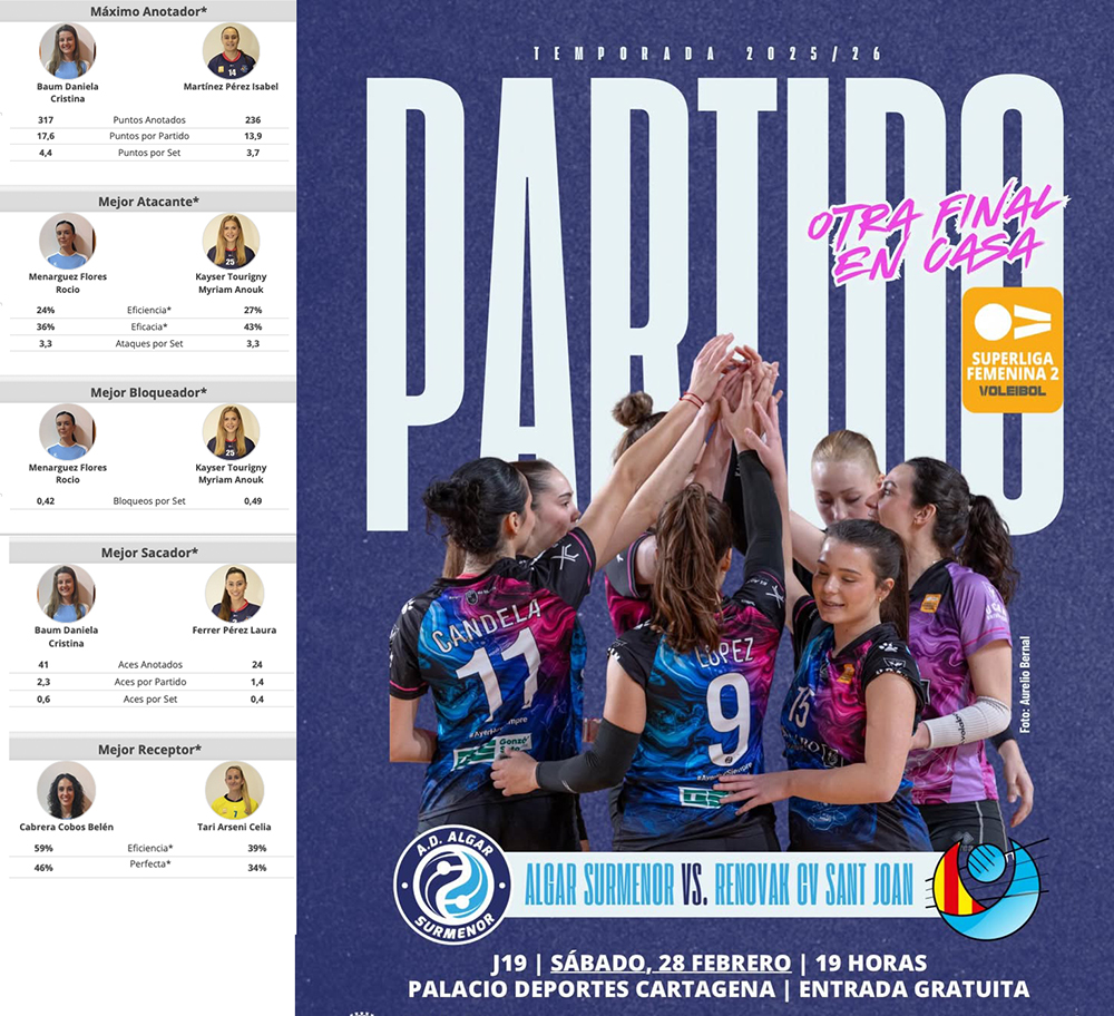 A diferencia de otros momentos de la temporada importantes en la briega que mantiene el Surmenor por no perder la categoría, esta vez no tendrá enfrente un adversario intratable o enrachado, pues CV Sant Joan de Alicante sólo ha podido vencer un partido (2-3 en la pista del CDU Atarfe) desde mediados de enero, lo que eleva las apuestas en favor del conjunto algareño que prepara Mariano Riganti para el partido de este próximo fin de semana, en el que el equipo local vuelve a jugar en sábado por la tarde-noche (19 horas, con entrada gratuita) en la pista auxiliar del Palacio de Deportes de Cartagena. Hay que matizar que ese dato aportado sobre Sant Joan no indica que será un rival fácil, en absoluto, pues las alicantinas tratarán de volver a la senda de las victorias y es obvio que pensarán que enfrentarse al antepenúltimo clasificado es una buena ocasión también.
