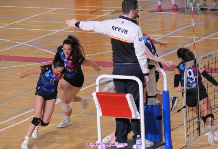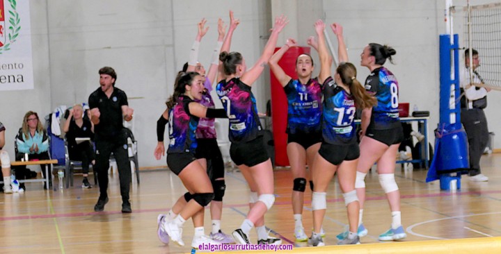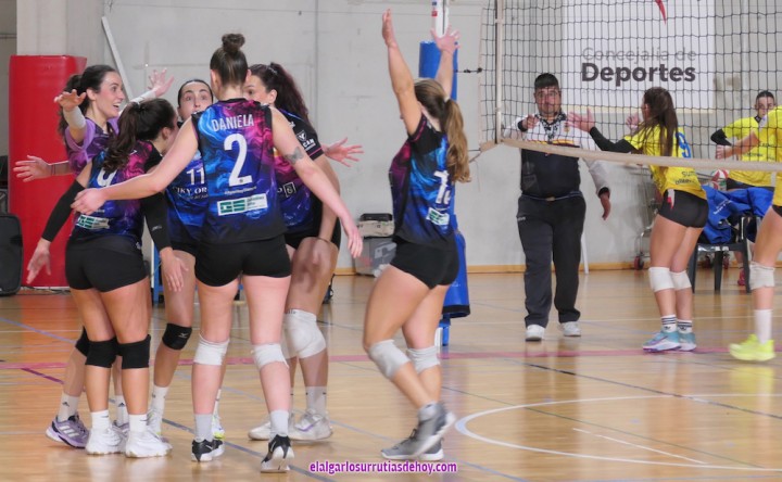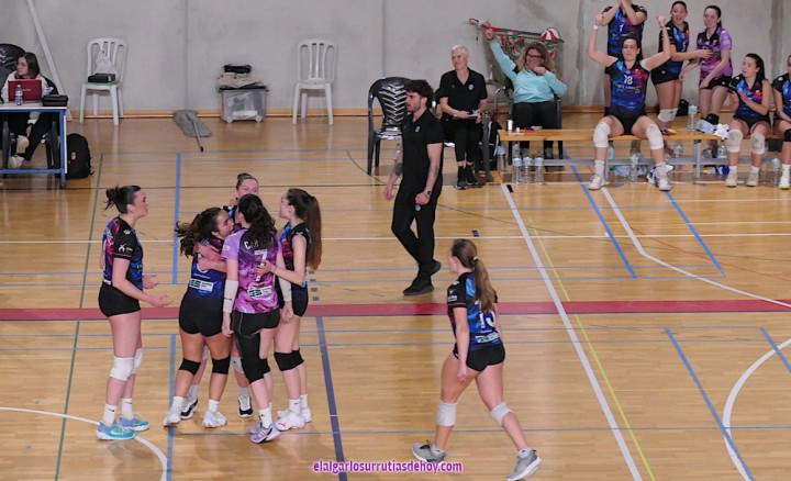 Golpea, encaja y resurge. Así se podría resumir el partido ofrecido esta tarde por la AD Algar Surmenor, se puso con dos sets de ventaja ante un San Juan que no se rindió y consiguió igualar la contienda, que tuvo que resolverse en el desempate. Con este triunfo, el conjunto algareño se aleja de los puestos de descenso cuando sólo quedan tres jornadas para concluir la liga. En las fotos se observa a las jugadoras de la ADAS celebrando puntos a su favor de dos formas distintas, con la novedosa 'rueda' y con un abrazo colectivo