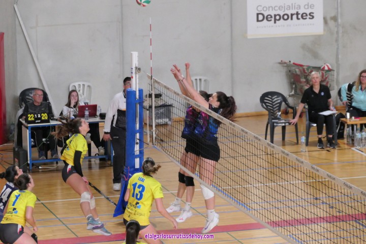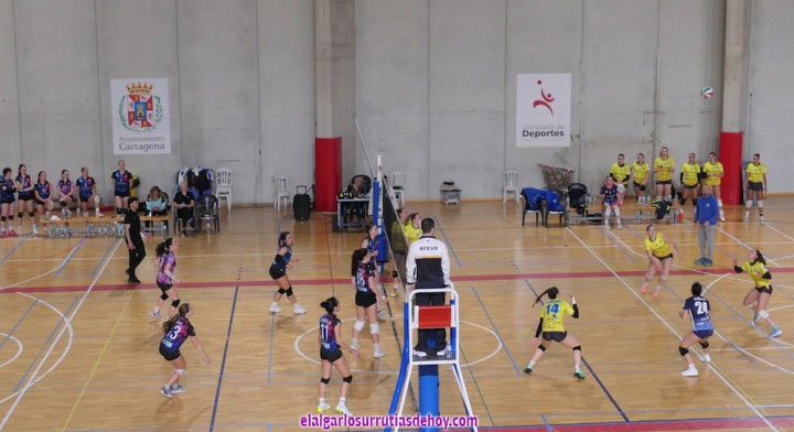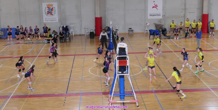 Partido de la jornada 19 del grupo C de la Superliga Femenina 2 de voleibol disputado en la pista auxiliar del Palacio de Deportes de Cartagena ante más de media grada ocupada por espectadores.