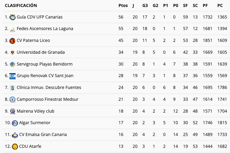 Los dos puestos de descenso los ocupan CDU Atarfe, que lo tiene muy complicado para evitar el descenso al acumular 13 puntos, y el CV Emalsa Gran Canaria, que ahora lleva 16, uno menos que el Surmenor y dos menos que Mairena.