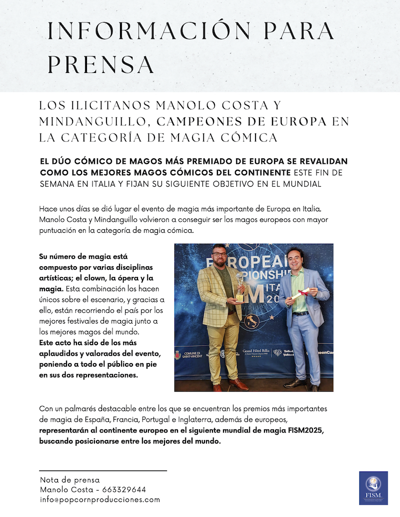 Los ilicitanos Manolo Costa y Mindaguillo, quienes lograron en Italia el título de campeones de Europa de magia cómica, ofrecen esta tarde en el Teatro Circo Apolo un espectáculo desbordante de diversión, que muestra que los sueños más alocados pueden hacerse realidad. Entradas a 12 euros.