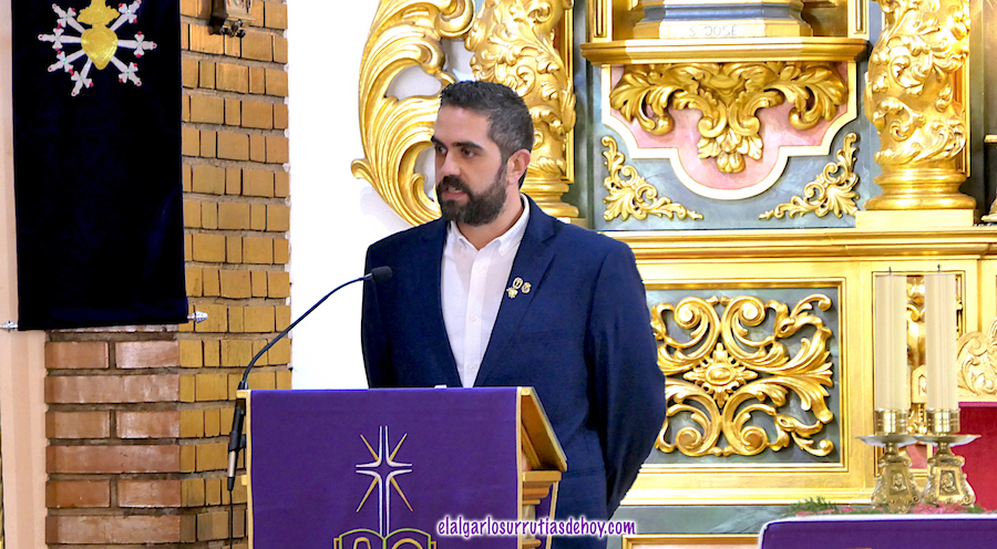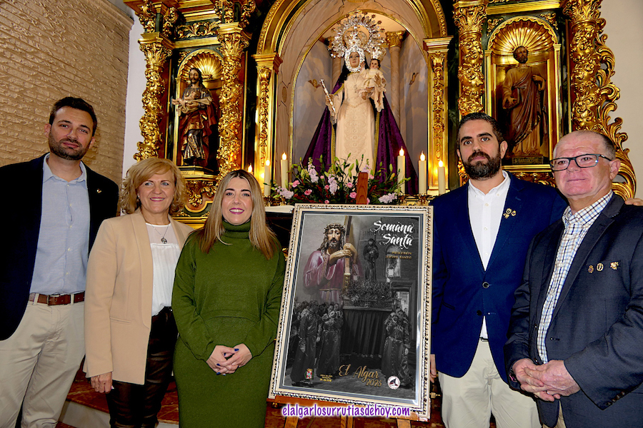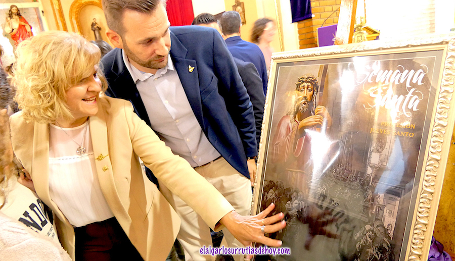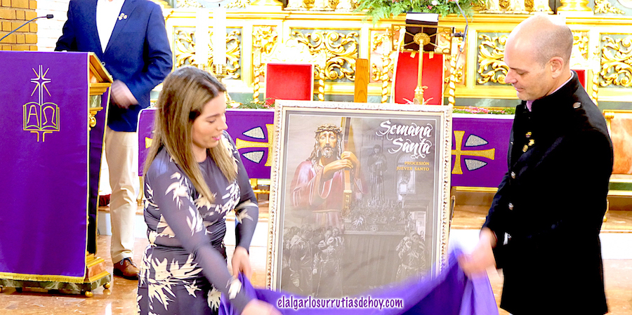 El cartel que anuncia la procesión del Jueves Santos del próximo 17 de abril fue descubierto el pasillo central de la iglesia de la Virgen de los Llanos, junto al altar, por la pregonera de este año, Irene Baños Guerrero, y el párroco, Antonio Guillén Campillo.