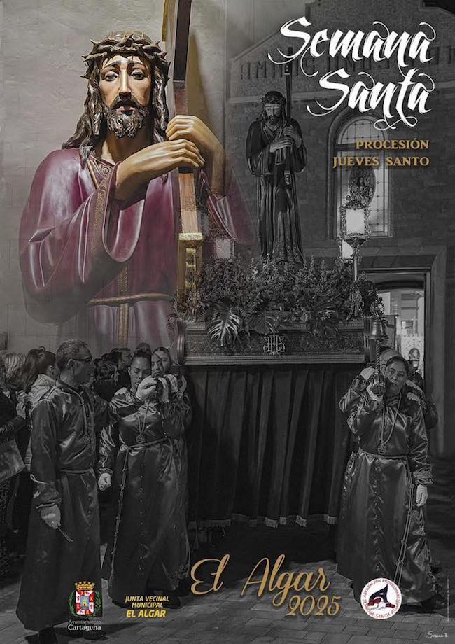 La fotógrafa algareña repite como autora de la imagen oficial de la Semana Santa de El Algar, siendo el epicentro de su trabajo este año la talla de 'Jesús del madero', que está en proceso de recuperar su fisonomía original, y la incorporación de las túnicas a los procesionistas del Jueves Santo, optando por combinar elementos en color con el blanco y negro.