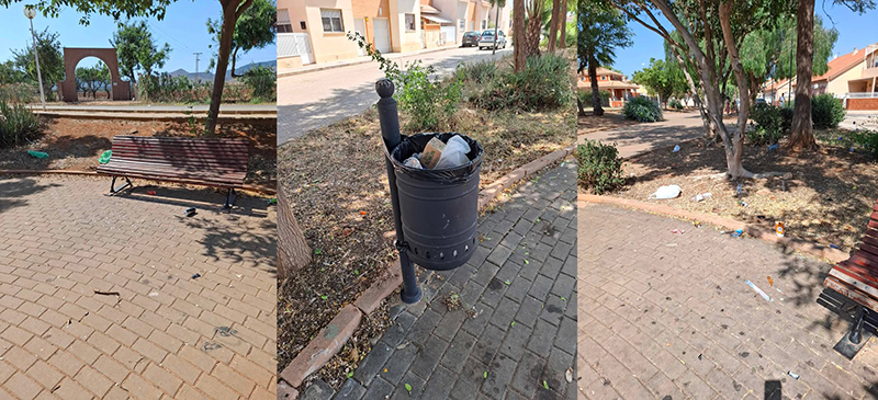 Un vecino se ha dirigido a nuestro 'Buzón de los lectores' aportando varias fotografías para mostrar la basura que hay en el parque de la calle Malva de El Algar "tras los fines de semana. Por más que nos quejamos, ni los servicios de limpieza del Ayuntamiento de Cartagena ni la Junta Vecinal Municipal ni la Policía Local hacen nada por más que nos quejamos", escribe.