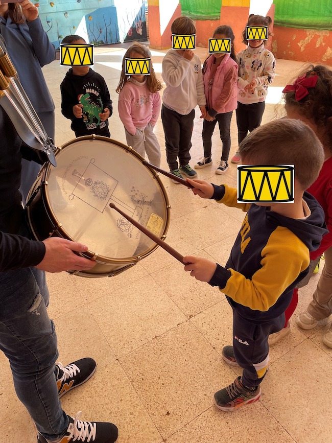 El integrante de esta banda Virgen la Caridad del municipio de La Unión, Aitor Bélmez y el director de esta misma, Jose Antonio Martínez, se dirigieron durante este recién acabado curso, hasta localidad cartagenera de El Algar, para participar en el proyecto de la música, enseñando a los pequeños de 5 años del colegio San Isidoro, las partes del tambor y materiales, marchas, ritmos...