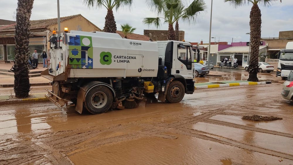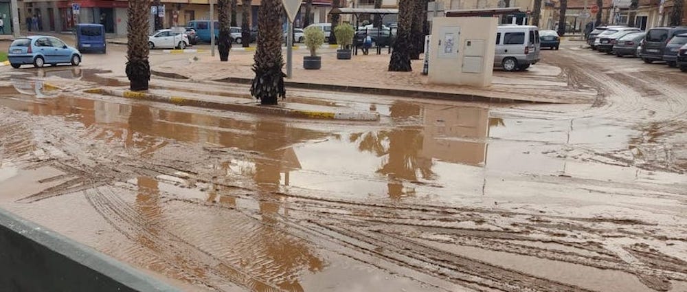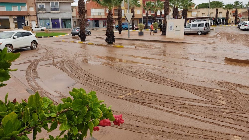 Aspecto que ofrece la plaza del Hondo de El Algar a media mañana de hoy como consecuencia del agua caída durante la madrugada y los arrastres procedentes de La Unión y de la sierra minera. El personal de limpieza municipal está actuando en la zona para tratar de que recupere su aspecto habitual cuanto antes. Las fotografías son aportadas por Juan Urrea Martínez.