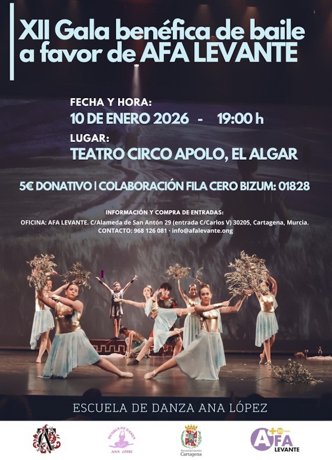 Danza y solidaridad se unen este sábado en la décimo segunda edición del evento soliario que organiza la escuela de danza Ana López, que recaudará fondos para la 'Asociación de Familiares de personas con Alzheimer u otras demencias en Cartagena y comarca'. El evento arrancará a a las 19 horas en el Teatro Circo Apolo de El Algar y las entradas se pueden comprar por 5 euros en la sede de la entidad social (Alameda de San Antón Calle Carlos V, número 3) de forma anticipada y en la propia taquilla del espacio cultural el mismo día de la gala.