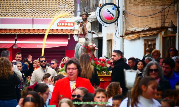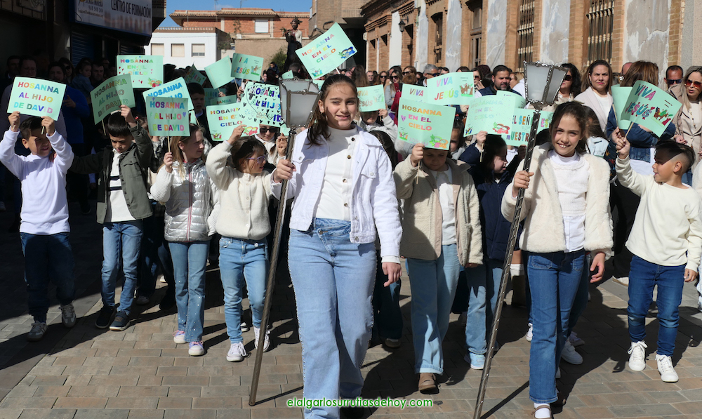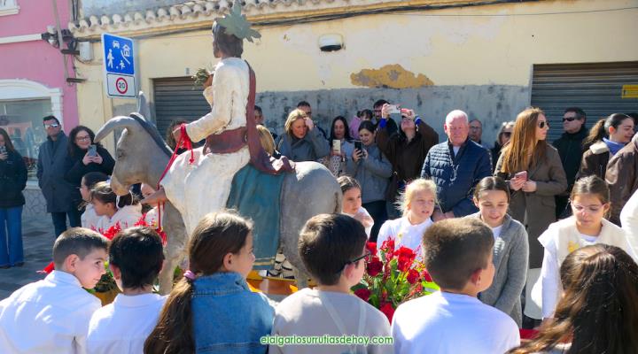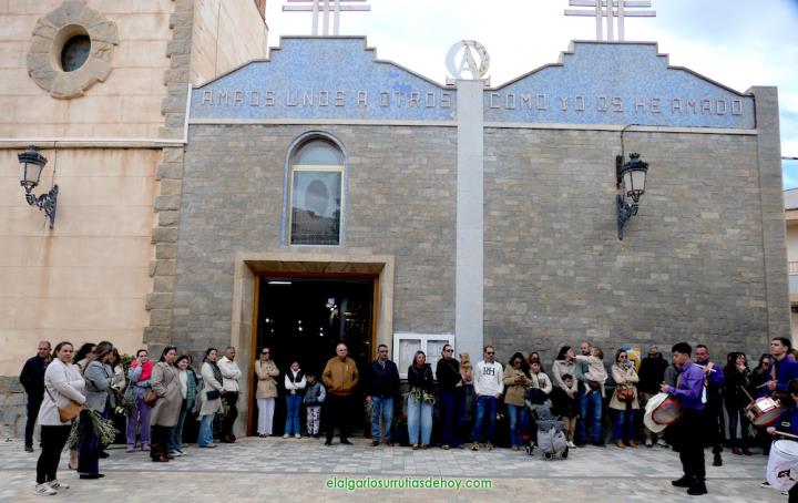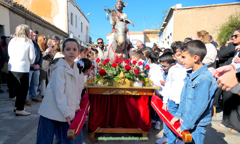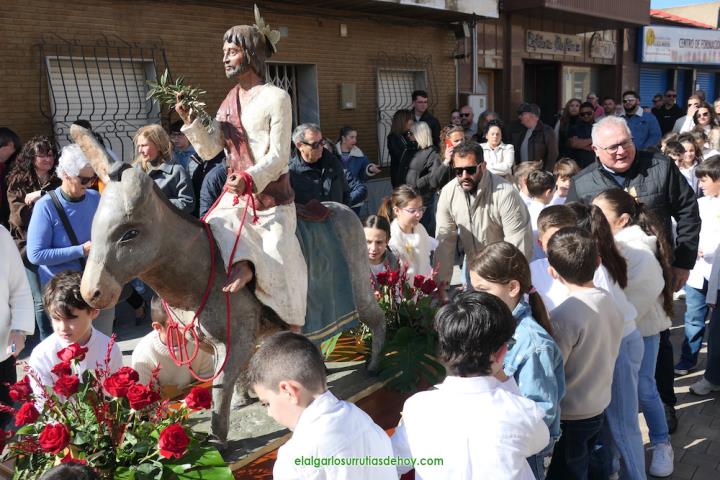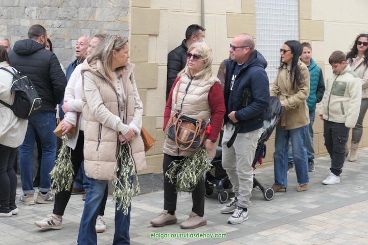 La comitiva, con el trono y encabezada por la banda de música de la Agrupación de la Semana Santa de El Algar, salió de la iglesia de Nuestra Señora de los Llanos con dirección a la plaza del Teatro Circo Apolo, donde fueron repartidas las palmas y ramas bendecidas por el párroco, Antonio Guillén Campillo, para después marchar hacia la iglesia emulando la jubilosa entrada de Jesús en Jerusalén y que en este caso representaba la llegada al templo algareño, donde después se celebró la eucaristía.