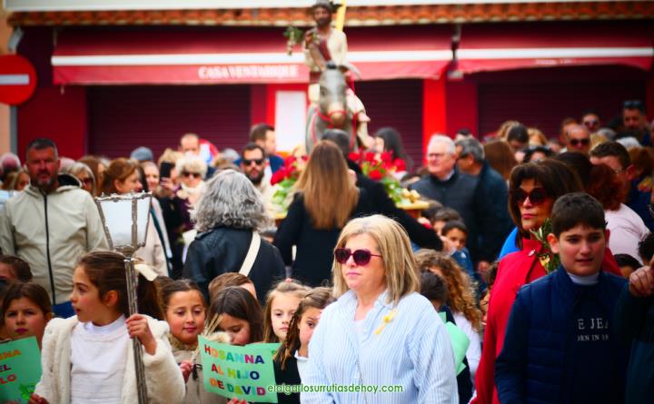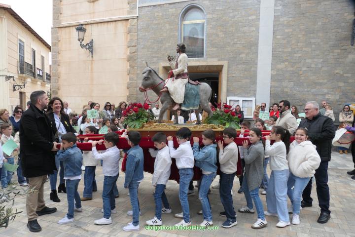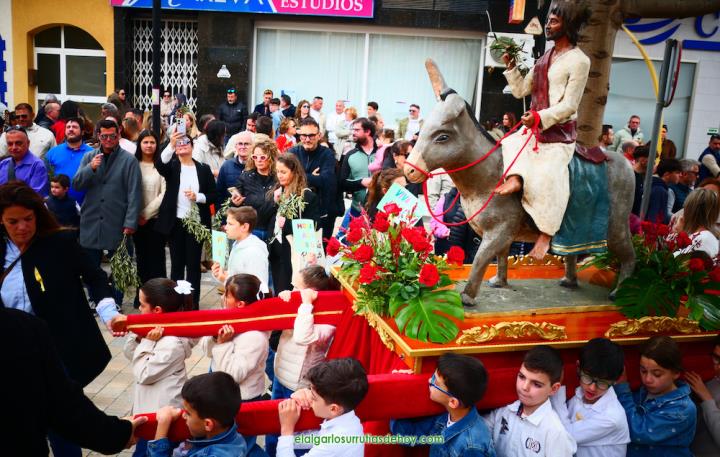 La representación de la entrada de Jesucristo en Jerusalén, entre palmas y ramas de olivo, contó con numerosos devotos acompañantes en una chocante mañana del domingo por el desagradable clima pese al sol reinante. La imagen de la burrica fue llevada a hombros por los niños que hacen este año la primera comunión.