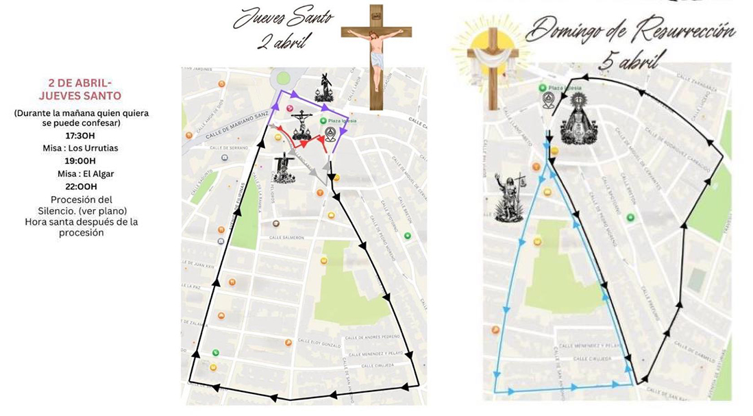 Recorrido del Jueves Santo: Plaza de la Iglesia Nuestra Señora Virgen de los Llanos, calle Sagasta, calle Dos Huertos, calle León XIII, Avda Filipinas, calle San Pablo, calle Calderón de la Barca, calle Piñero, calle Sagasta y plaza de la Iglesia, donde se cantará la Salve, sonará el himno de España y tendrá lugar la recogida de la procesión.