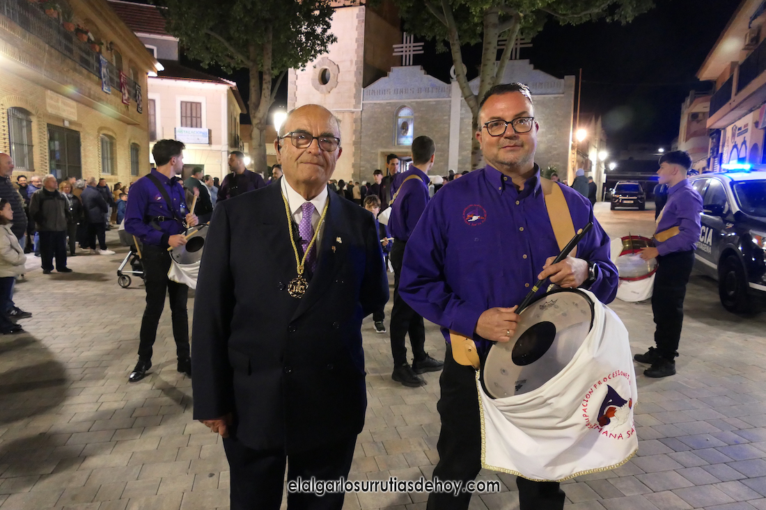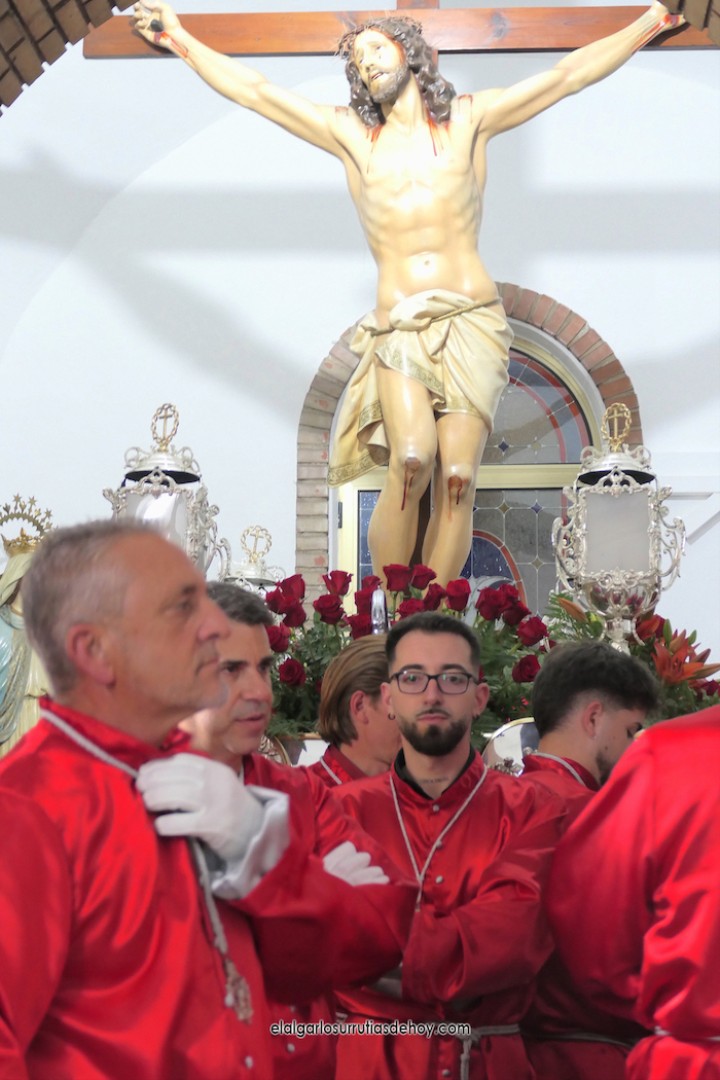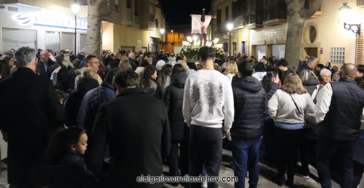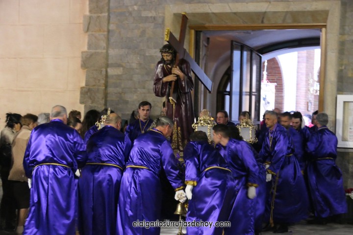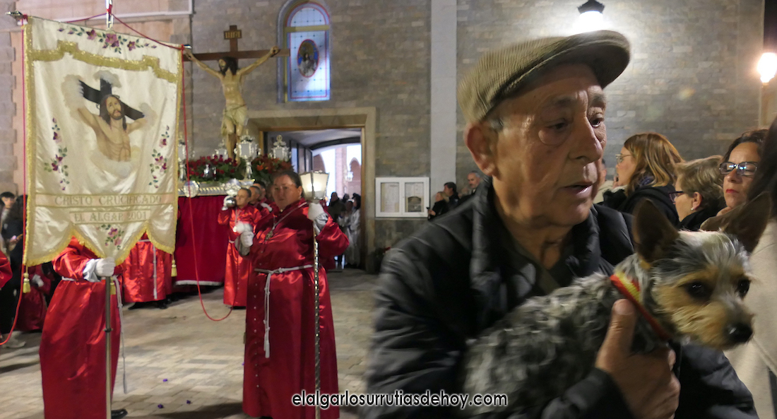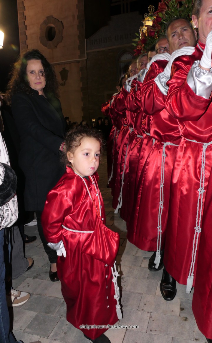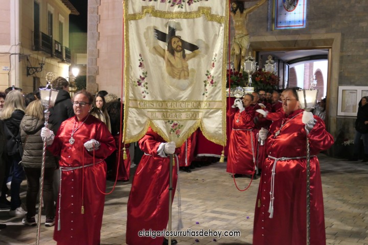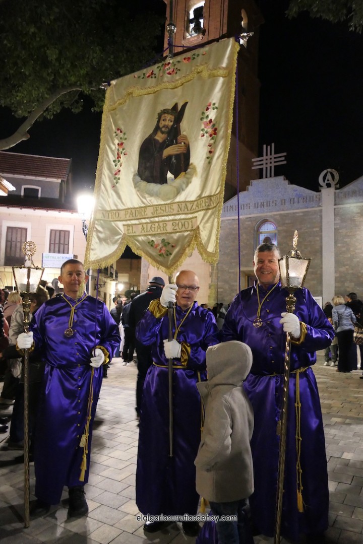 Cierran el cortejo las promesas, quienes marchan por detrás del párroco, Antonio Guillén Campillo, y del presidente de la Junta Municipal de El Algar, Salvador García. Fuera de protocolo están como cofrades la edil Paqui Martínez Sotomayor (con el grupo del estandarte de la Virgen) y el presidente de la asociación de vecinos, Pedro García (como capataz del trono del Crucificado), además del presidente de honor de la Semana Santa, Anastasio Guerrero, metiendo el hombro bajo el Nazareno.