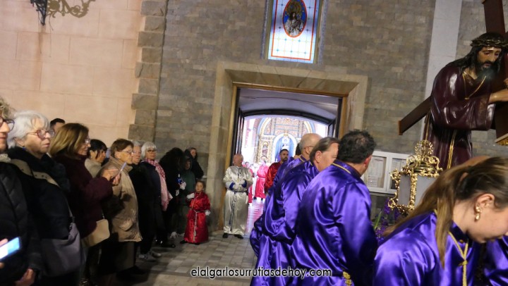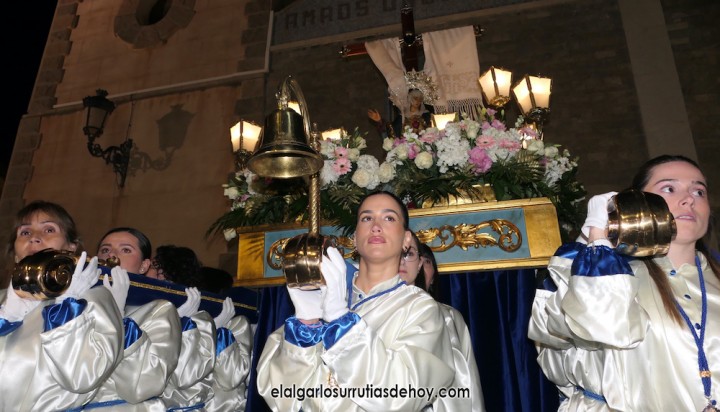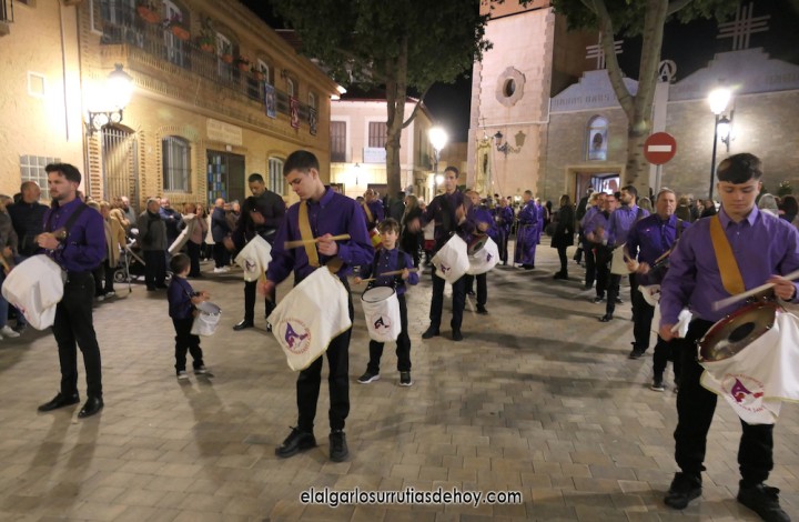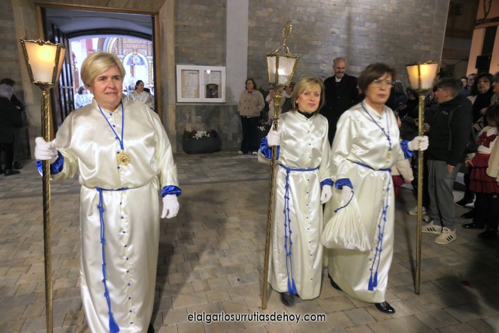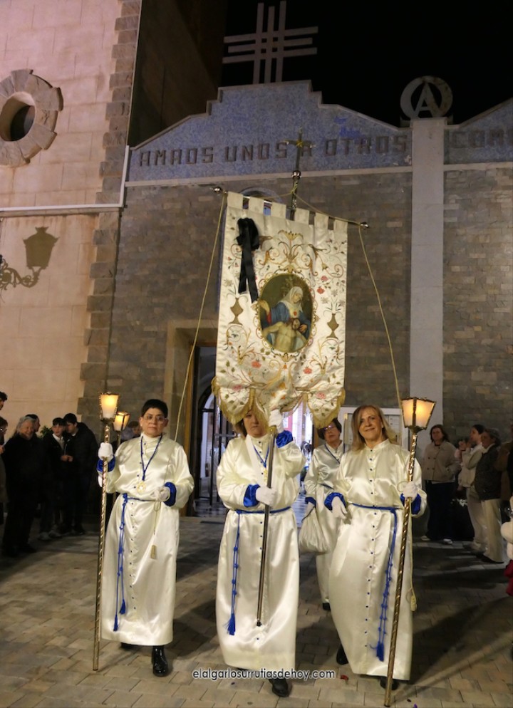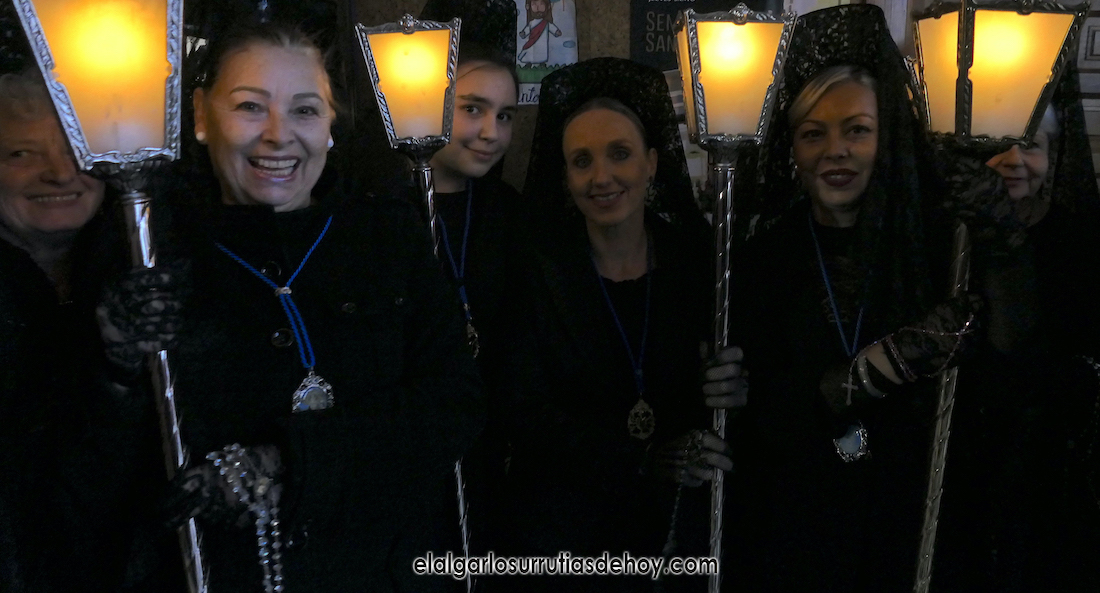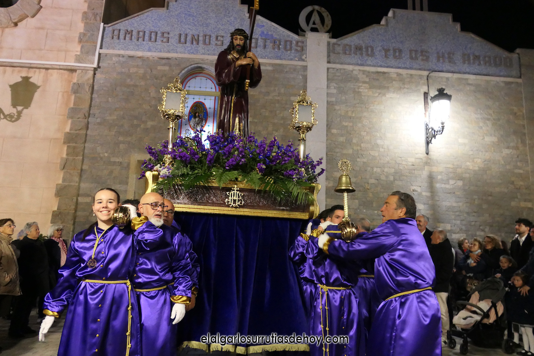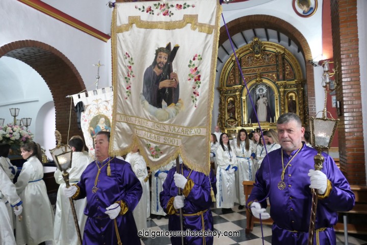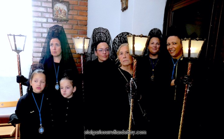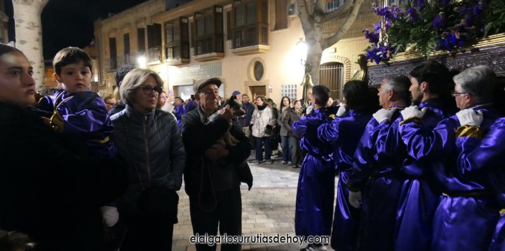 Cierran el cortejo las promesas, quienes marchan por detrás del párroco, Antonio Guillén Campillo, y del presidente de la Junta Municipal de El Algar, Salvador García. Fuera de protocolo están como cofrades la edil Paqui Martínez Sotomayor (con el grupo del estandarte de la Virgen) y el presidente de la asociación de vecinos, Pedro García (como capataz del trono del Crucificado), además del presidente de honor de la Semana Santa, Anastasio Guerrero, metiendo el hombro bajo el Nazareno.