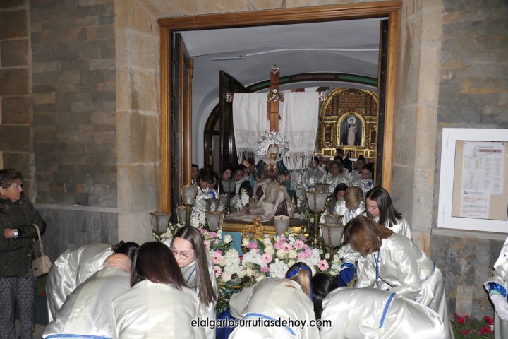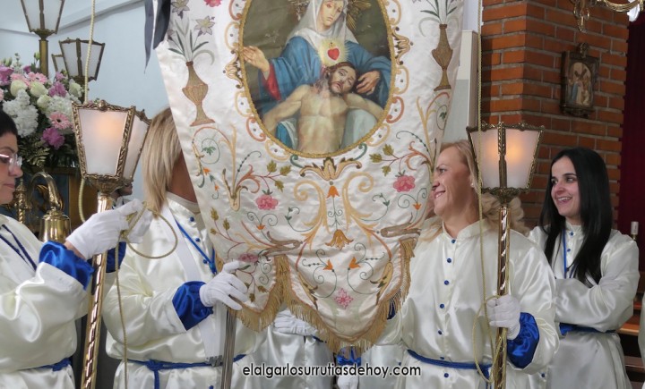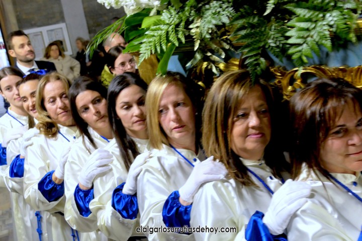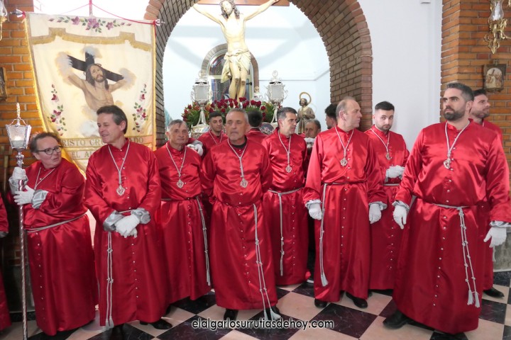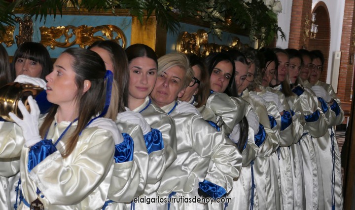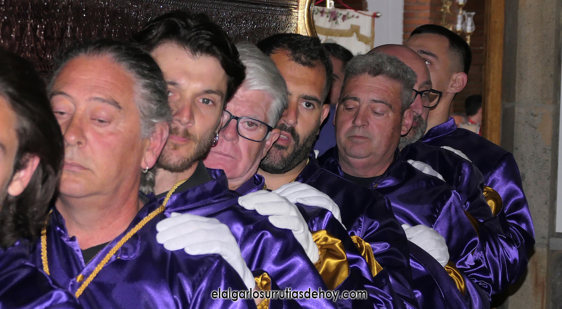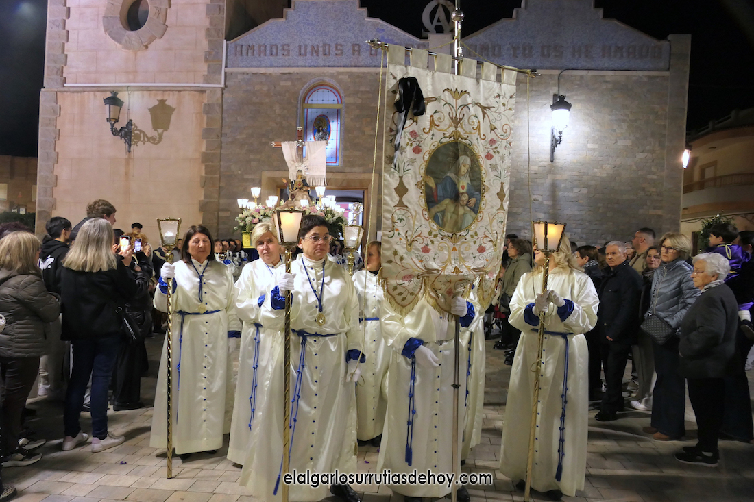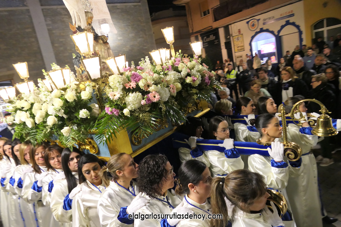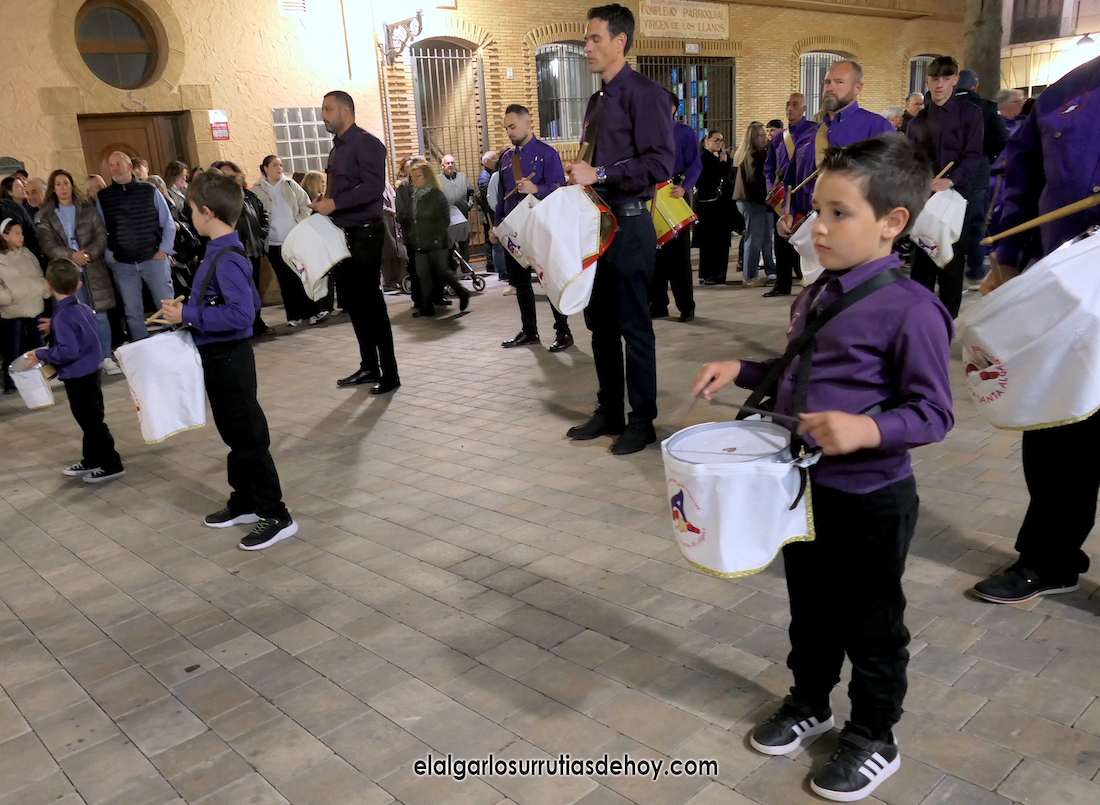 Cierran el cortejo las promesas, quienes marchan por detrás del párroco, Antonio Guillén Campillo, y del presidente de la Junta Municipal de El Algar, Salvador García. Fuera de protocolo están como cofrades la edil Paqui Martínez Sotomayor (con el grupo del estandarte de la Virgen) y el presidente de la asociación de vecinos, Pedro García (como capataz del trono del Crucificado), además del presidente de honor de la Semana Santa, Anastasio Guerrero, metiendo el hombro bajo el Nazareno.
