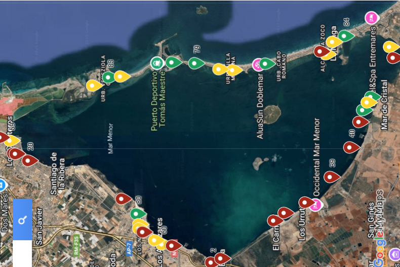 'Por un Mar Menor vivo' ha llevado a cabo un sondeo telemático entre internautas para recabar opiniones sobre el estado del agua y de los arenales de la laguna salada, entre otros factores, como la acumulación de basura, habiendo emitidos votos y comentarios este año de 38 playas. La también conocido como 'la playa del Carmolí' ha sido considerada la mejor, no recibiendo punto alguno favorable, mientras que Los Urrutias queda en quinto puesto. Entre las mejores hay 3 puntos de La Manga, Punta Calera de Los Alcázares y Mar de Cristal. El plano adjunta marca con colores el nivel de cada playa, según las votaciones