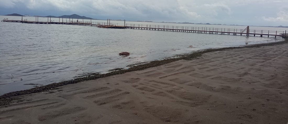 La situación con las lluvias ha sido más tranquila en Los Urrutias que en el interior de la diputación. La imagen de Juan Pagán muestra el aspecto que ofrece esta mañana el Mar Menor en el pueblo, con una tonalidad marrón que apenas se da en la orilla, a diferencia de las desembocaduras de ramblas en la laguna salada.