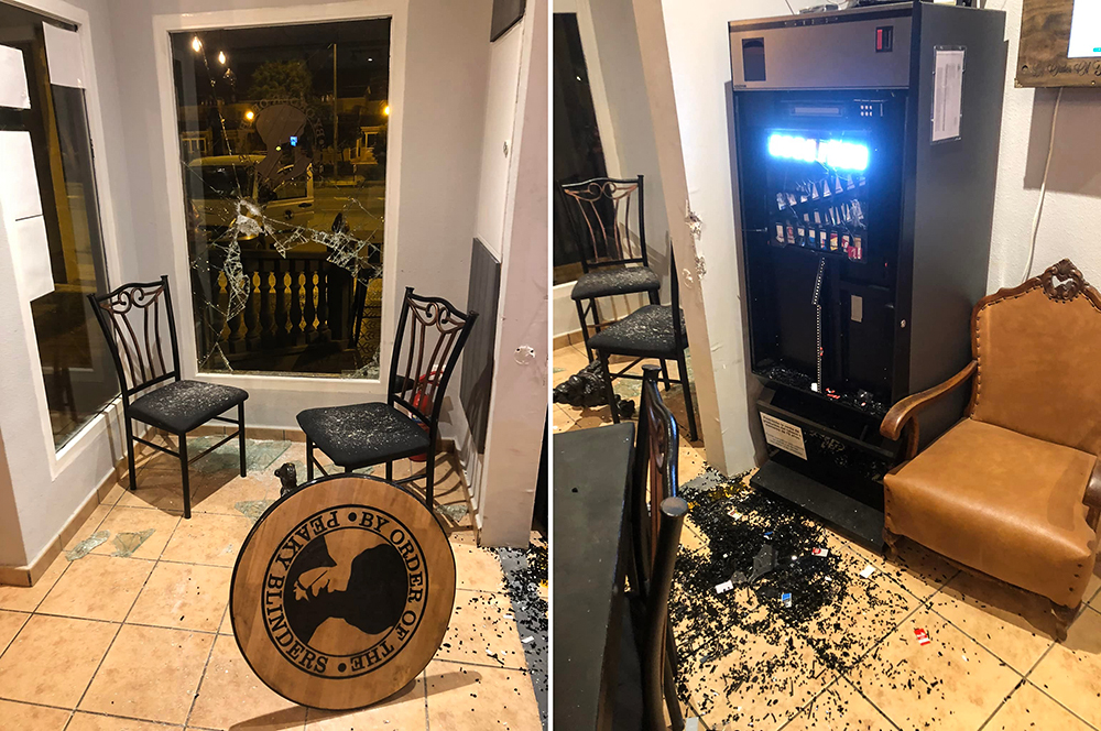 Sobre las dos de la madrugada de la noche del 10 al 11 de marzo tuvo lugar el primer robo ‘Peaky Blinders Bar’. Rompieron un gran ventanal para acceder al interior, lo que generó pérdidas, daños y que no abriera el establecimiento ubicado en el arco sur del Mar Menor a la mañana siguiente. La foto fue publicada en el perfil de Facebook del bar: