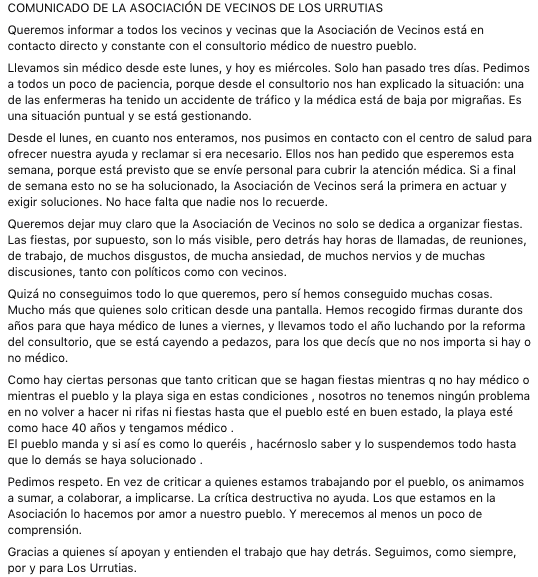 * Comunicado de la AAVV Los Urrutias publicado en su perfil de Facebook