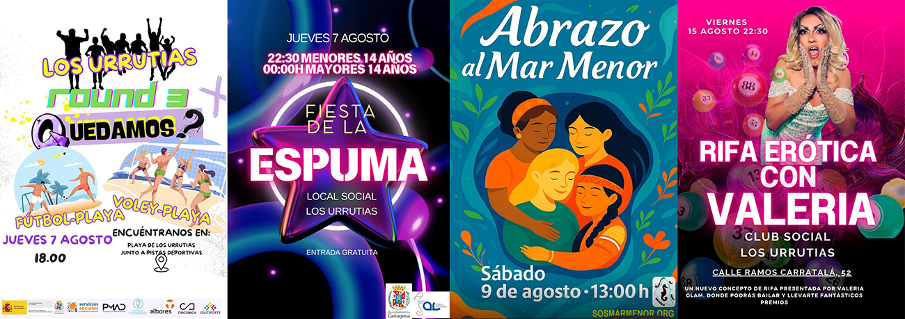 Ya se conoce algunas de las actividades y convocatorias para los próximos días junto a la costa del arco sur la laguna salada, como es la doble propuestas para el jueves con la quedada para fútbol y voley en formatos de playa y la fiesta de la espuma, mientras que el sábado es el abrazo al Mar Menor. De la semana siguiente ya se conoce cuándo regresará la rifa erótica.