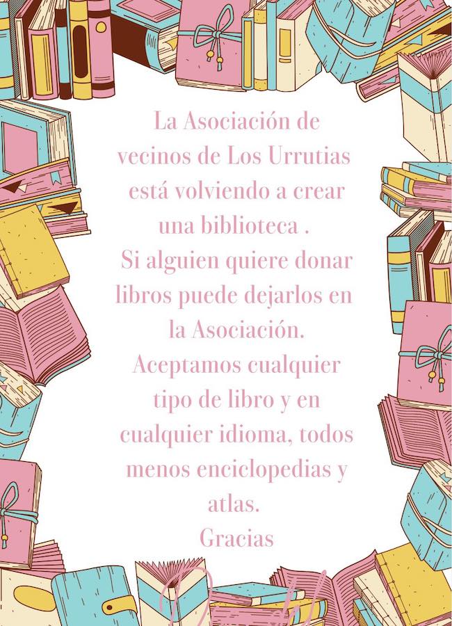 La Asociación de Vecinos de Los Urrutias informa que está volviendo a montar una biblioteca en el pueblo, por lo que acepta libros en cualquier idioma, descartándose enciclopedias y atlas. Las donaciones se puede efectuar en el centro social.