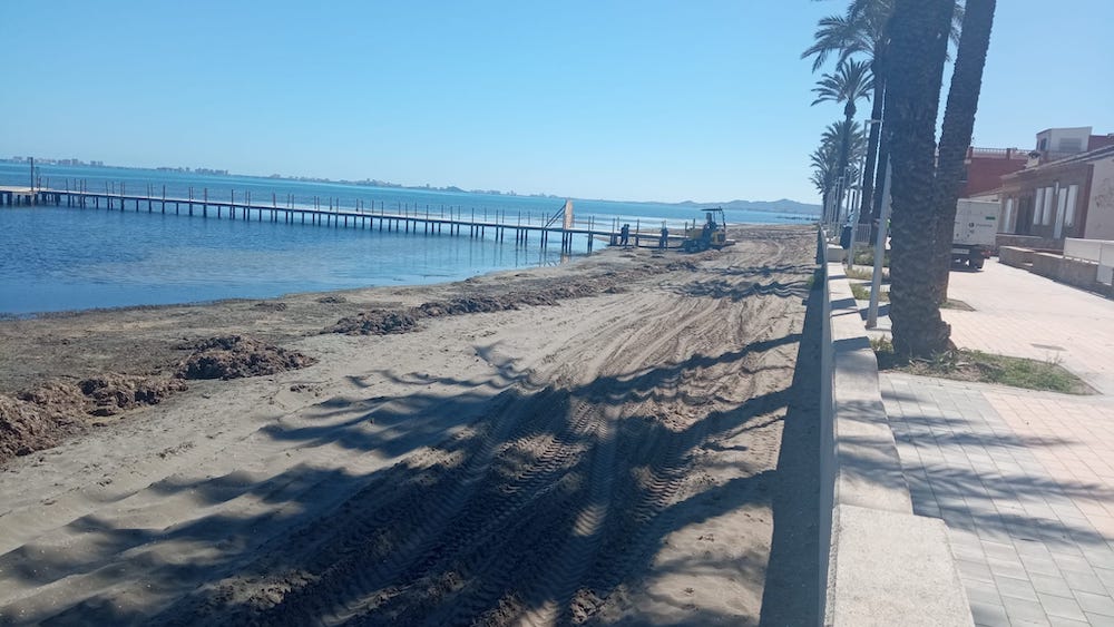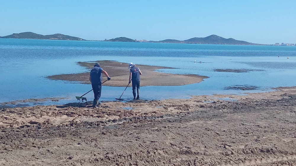 La manual (e insuficiente) labor de limpieza de la playa de Los Urrutias continúa, ahora también acompañada por el trabajo en la arena para un mejor aspecto de cara a la Semana Santa, cuando volverá a aumentar la cifra de residentes y visitantes.